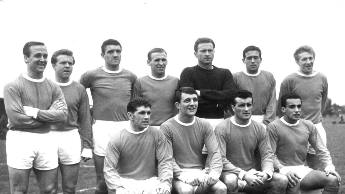 The Man United team in Cork in 1963. Back: Maurice Setters, Albert Quixall, Bill Foulkes, Pat Crerand, Harry Gregg, Shay Brennan, Denis Law. Front: John Giles, David Herd, Noel Cantwell, Ian Walker.