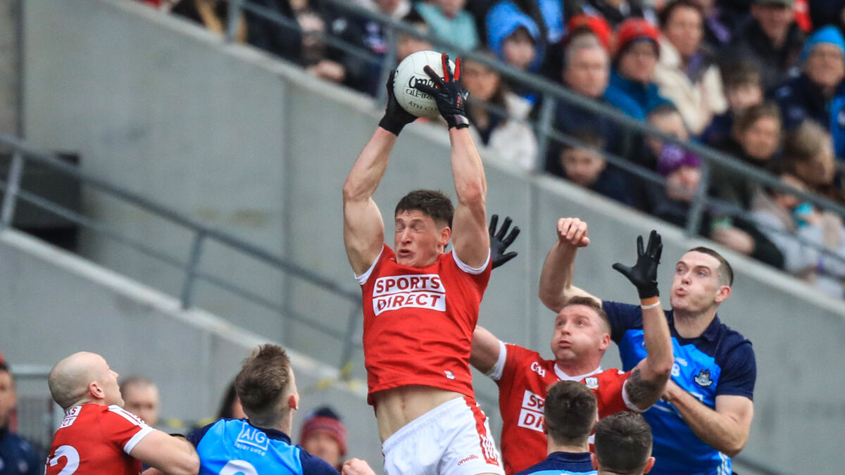 Cork’s Colm O'Callaghan wins the high ball against Dublin's Brian Fenton in the 2023 Allianz football league Division 2 clash in Páirc Uí Chaoimh. Picture: INPHO/Evan Treacy