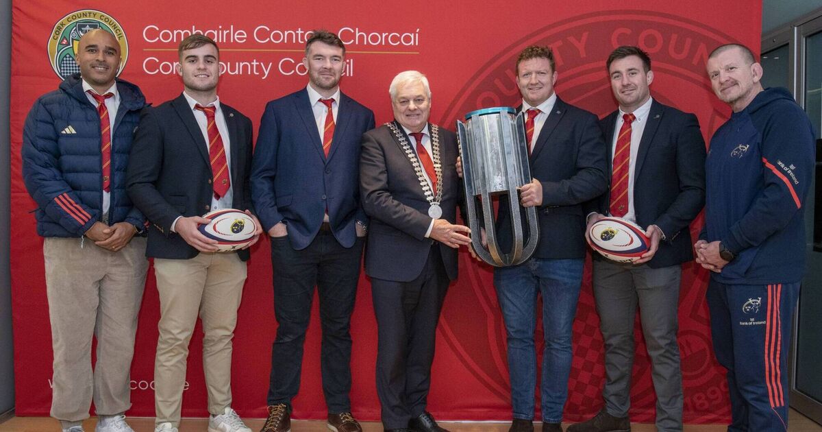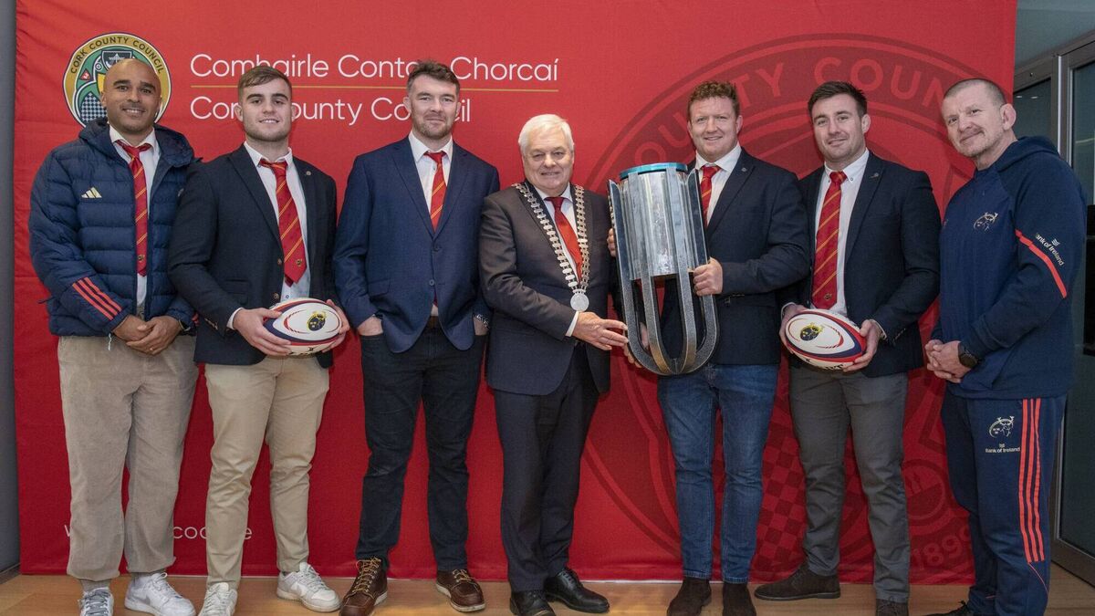 United Rugby Championship Winners Munster Honoured at Cork County Hall - Mayor of the County of Cork, Cllr. Frank O’Flynn welcomed the Munster Rugby team to a civic reception at Cork County Hall to mark their triumphant victory in the United Rugby Championship over reigning champions, The Stormers. Pictured with the Mayor of the County of Cork, Cllr Frank O'Flynn are, from left: Simon Zebo; Alex Kendellan; Peter O'Mahony; Stephen Archer, Niall Scannell and Munster head coach Graham Rowntree. Pic: Brian Lougheed