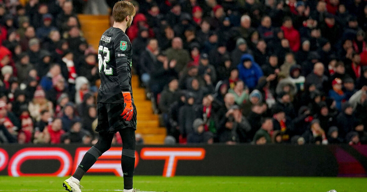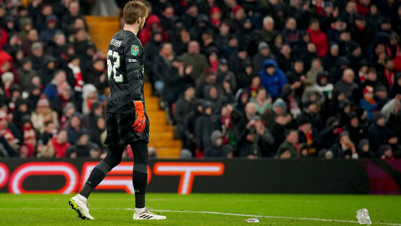 Liverpool goalkeeper Caoimhin Kelleher removes a pie that was thrown from the pitch during the Carabao Cup quarter-final at Anfield. Picture: Peter Byrne/PA Wire.