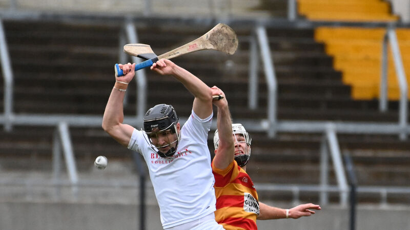 Blarney's Pádraig Power (white kit) and Newcestown's Gearóid O'Donovan contest possession in the the Co-op SuperStores Cork SAHC final replay. Picture: Eddie O'Hare