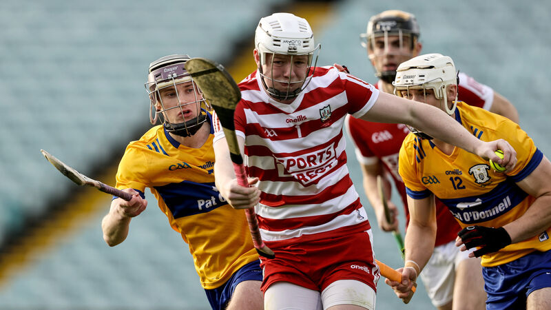 Cork goalkeeper Bríon Saunderson holds possession despite the attentions of Clare pair David Kennedy and Keith Smyth in last year's oneills.com Munster U20HC final. Picture: Inpho/Ben Brady
