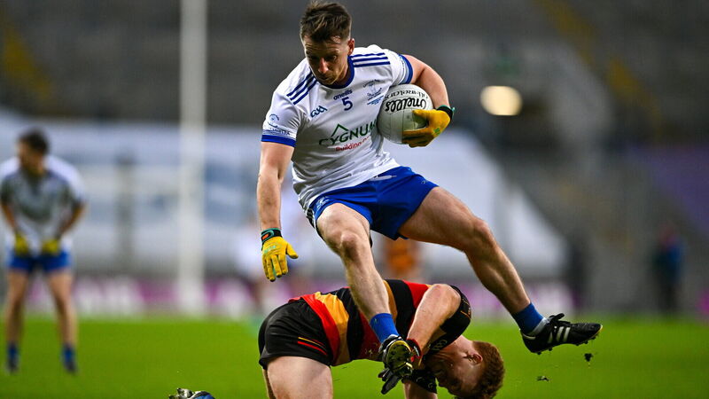Danny Ó Conaill of Cill na Martra jumps over the tackle of Jason Duffy of St Patrick's Cullyhanna during the AIB GAA Football All-Ireland Intermediate Club Championship final at Croke Park. Picture: Ben McShane/Sportsfile