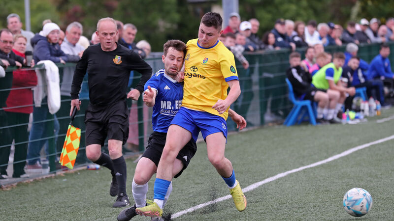 Dylan O'Flaherty, Carrigaline United, battles David Tobin, Wilton United, at Ballea Park. Picture: Jim Coughlan.
