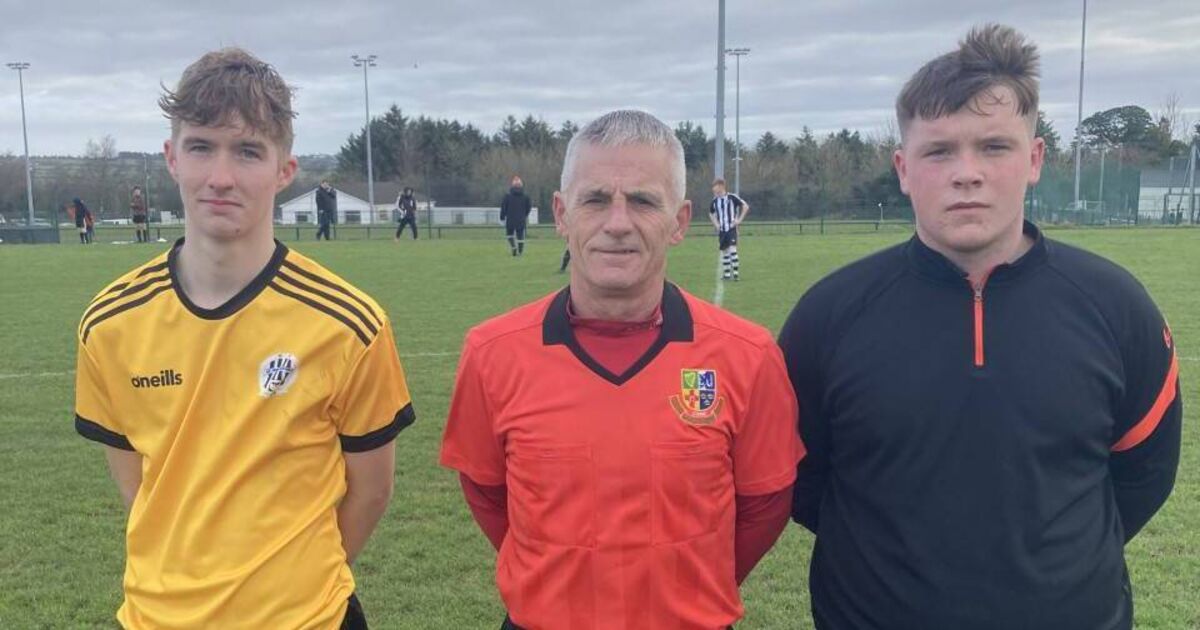 Referee Timmy Kelleher with St Mary's captain Jake Heaphy and St John Bosco's captain Fionn Keohane before their U19 Cup game at St Mary's Park.