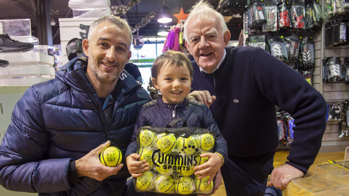 Kevin Cummins (right) pictured with his nephew Brendan Cummins Jr and Brendan's son William before the 2021 All-Ireland SHC final. William holds a case of Cummins All-Star sliothars bearing the name of great-grandfather, also William Cummins. Picture: Dan Linehan