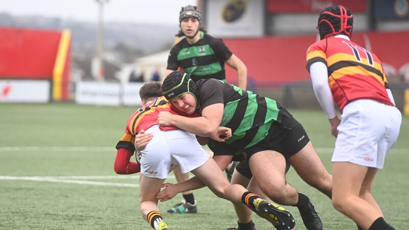 Jack Deasy, Bandon Grammar School makes a tackle on Eamon O'Sullivan, Christian Brothers College in the Munster Schools Junior Rugby Cup, Round 1 (quarter final qualifer) Bandon Grammar School vs Christian Brothers College CBC at Virgin Media Park. Pic Larry Cummins