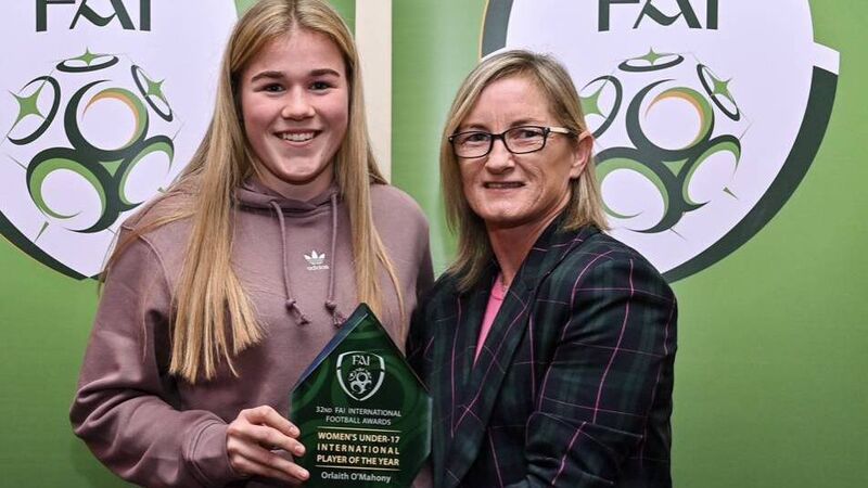 Orlaith O'Mahony being presented with the Ireland U17 Player of the Year award by Olivia O'Toole.