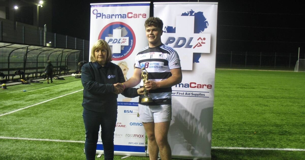 Liz Farr (Pharmacare) presents the Man of the Match award to Rhys Dunne (St Nick's)