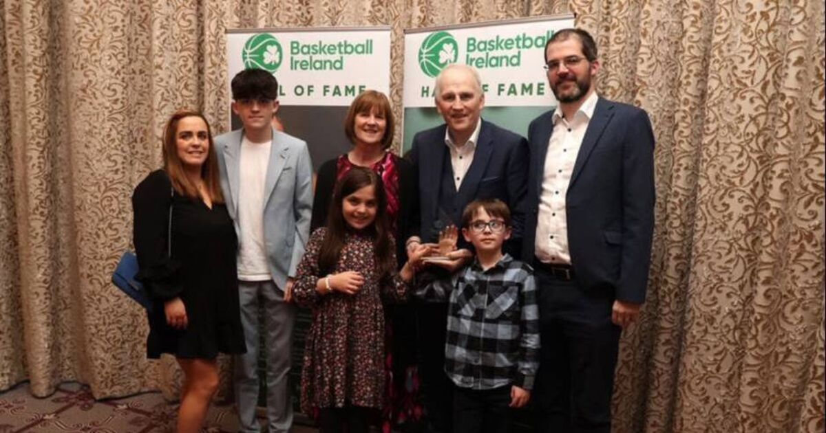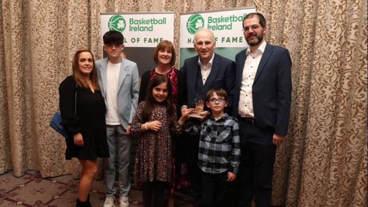 Tim McCarthy with his wife Ann and family after he was inducted into the Basketball Ireland Hall of Fame at the National Arena last year.