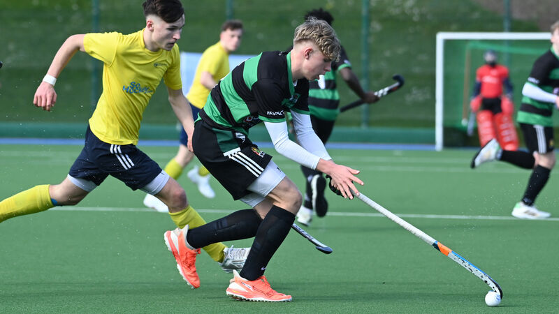 Sam Dale, captain Bandon Grammar School with possession in the So Hockey Munster Boys Senior A Cup final at Garryduff. Newtown School vs Bandon Grammar School. Pic Larry Cummins Garate eventually made a period of concerted pressure tell, firing in a short corner he had forced himself — 2-1 at the break.