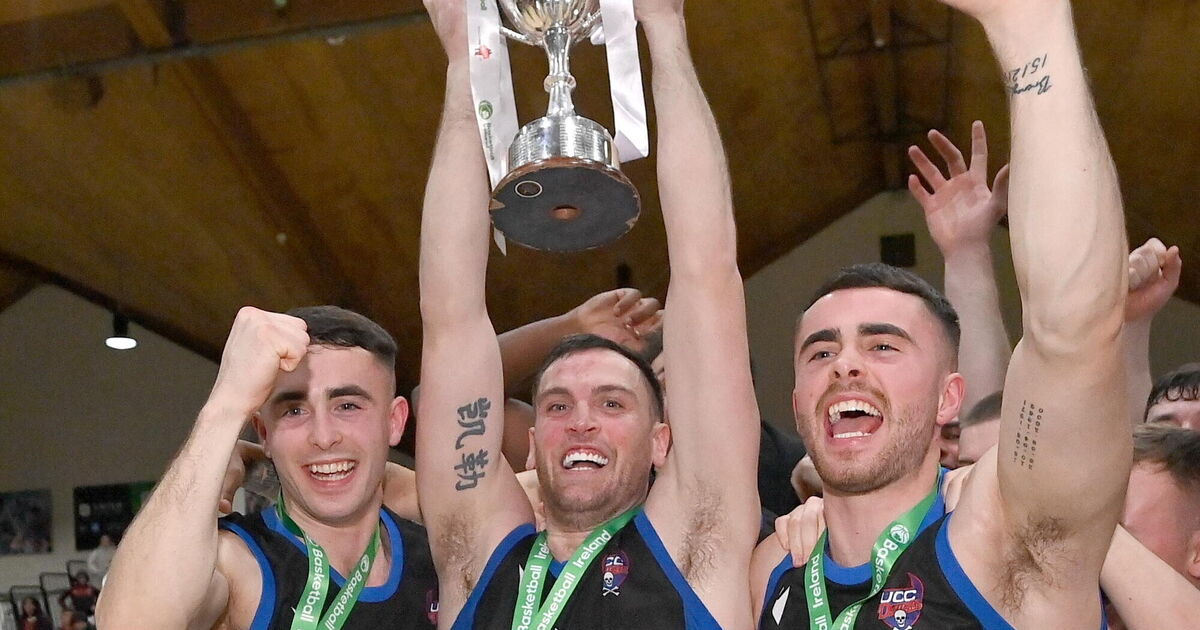 UCC Demons captain Kyle Hosford, with teammates James Hannigan, left, and Scott Hannigan, celebrate with the trophy after their side's victory in the Basketball Ireland Pat Duffy National Cup Final match between Irish Guide Dogs Ballincollig and UCC Demons at the National Basketball Arena in Tallaght, Dublin. Photo by Seb Daly/Sportsfile