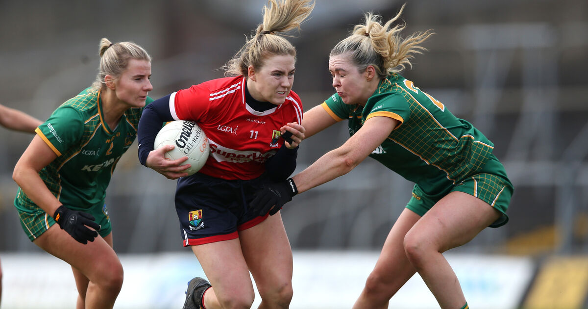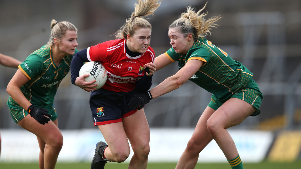 Cork's Libby Coppinger takes on Meath's Katie Newe and Lisa Young during their Lidl Ladies National Football League Division 1, clash at Pairc Tailteann. Picture: INPHO/Leah Scholes