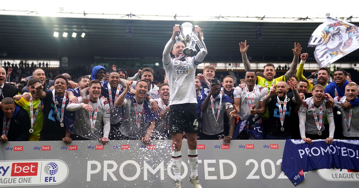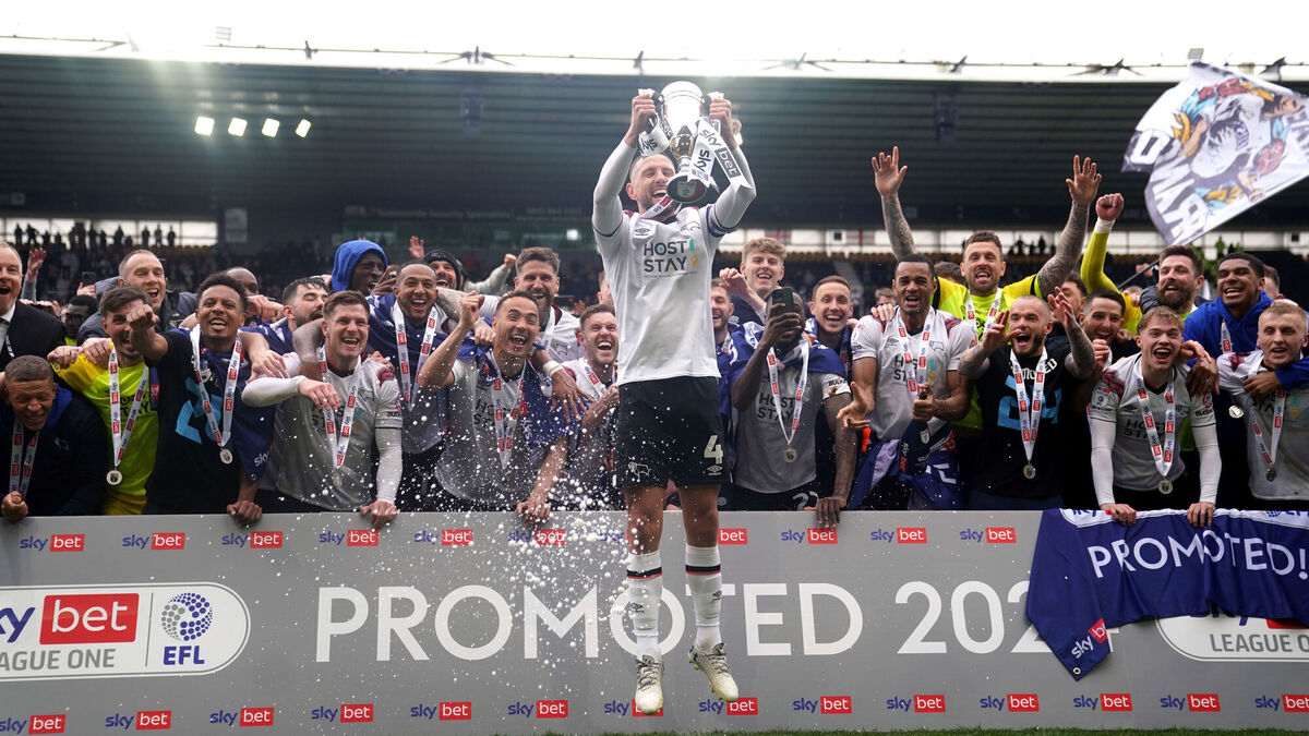 Derby County's Conor Hourihane lifts the League One runners up trophy after the final whistle of the Sky Bet League One match at Pride Park Stadium, Derby.
