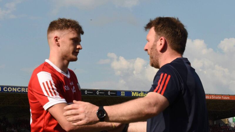 Alan Connolly is congratulated by Cork selector - and Blackrock colleague - Wayne Sherlock after being substituted against Tipperary. Picture: George Hatchell