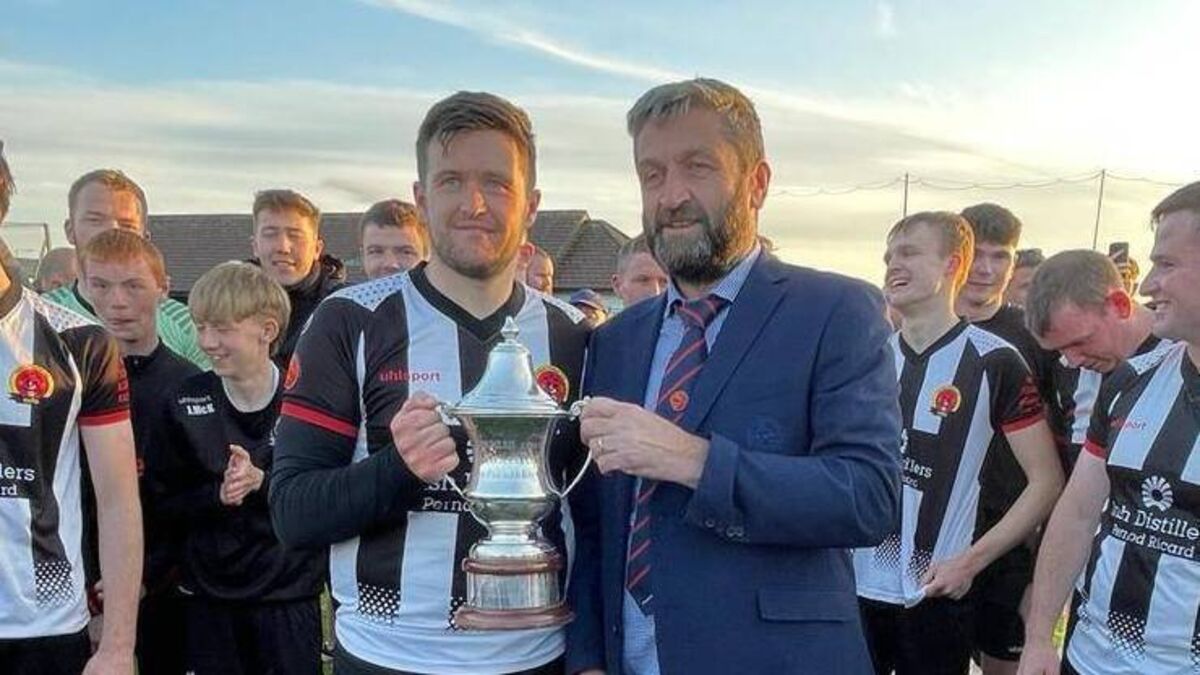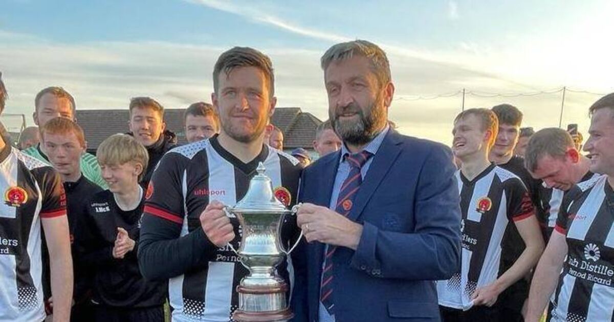 Munster Senior League chairman John Finnegan presents the Beamish Stout Senior Premier Division trophy to Midleton captain Jake Hegarty after their win over Cobh Wanderers.