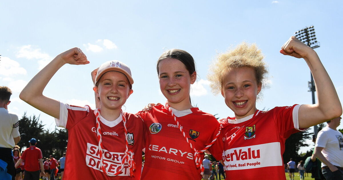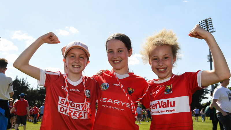 Cork supporters Ali May Kirwan, Amy O'Callaghan and Ruby Mehigan celebrate at Páirc Uí Rinn. Picture: Matt Browne/Sportsfile