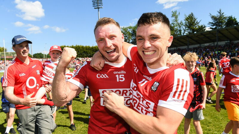 Cork players Brian Hurley and Seán Powter celebrate after beating Donegal. Picture: Matt Browne/Sportsfile