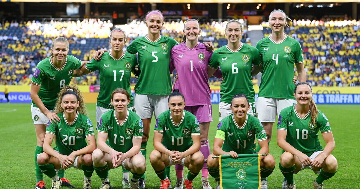 The Republic of Ireland team, back row, from left, Ruesha Littlejohn, Lily Agg, Caitlin Hayes, Courtney Brosnan, Megan Connolly and Louise Quinn with front, from left, Leanne Kiernan, Aoife Mannion, Jess Ziu, Katie McCabe and Kyra Carusa pose for a team photo before the 2025 UEFA Women's European Championship qualifying match