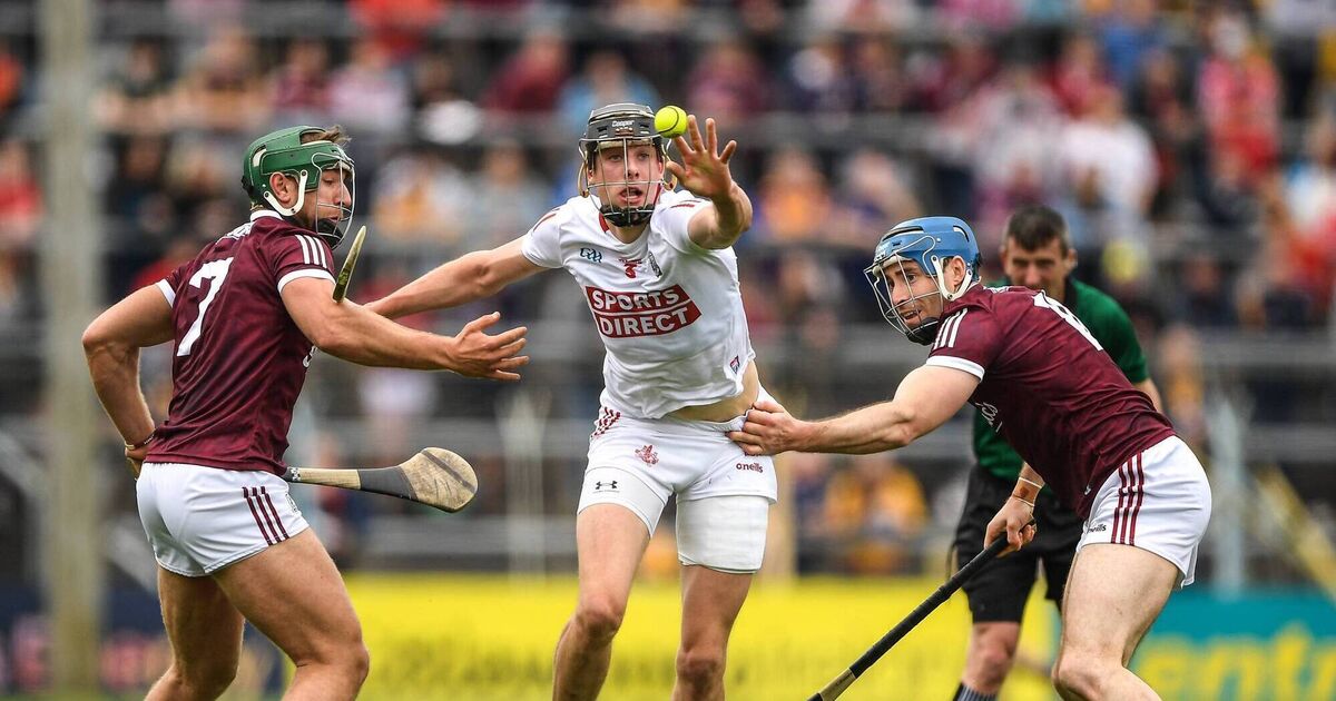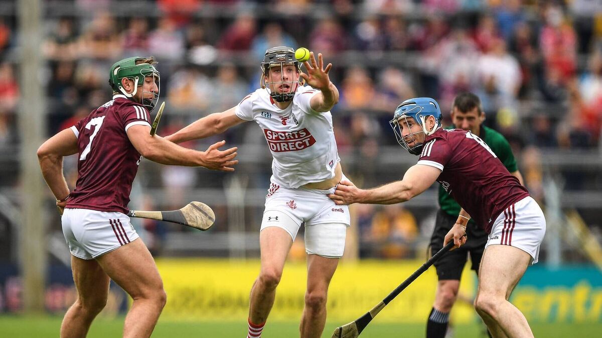 Robert Downey of Cork is tackled by Fintan Burke and Conor Cooney of Galway during the 2022 All-Ireland quarter-final at FBD Semple Stadium in Thurles. Picture: Ray McManus/Sportsfile