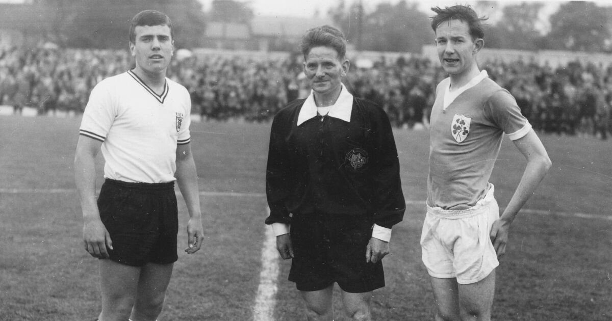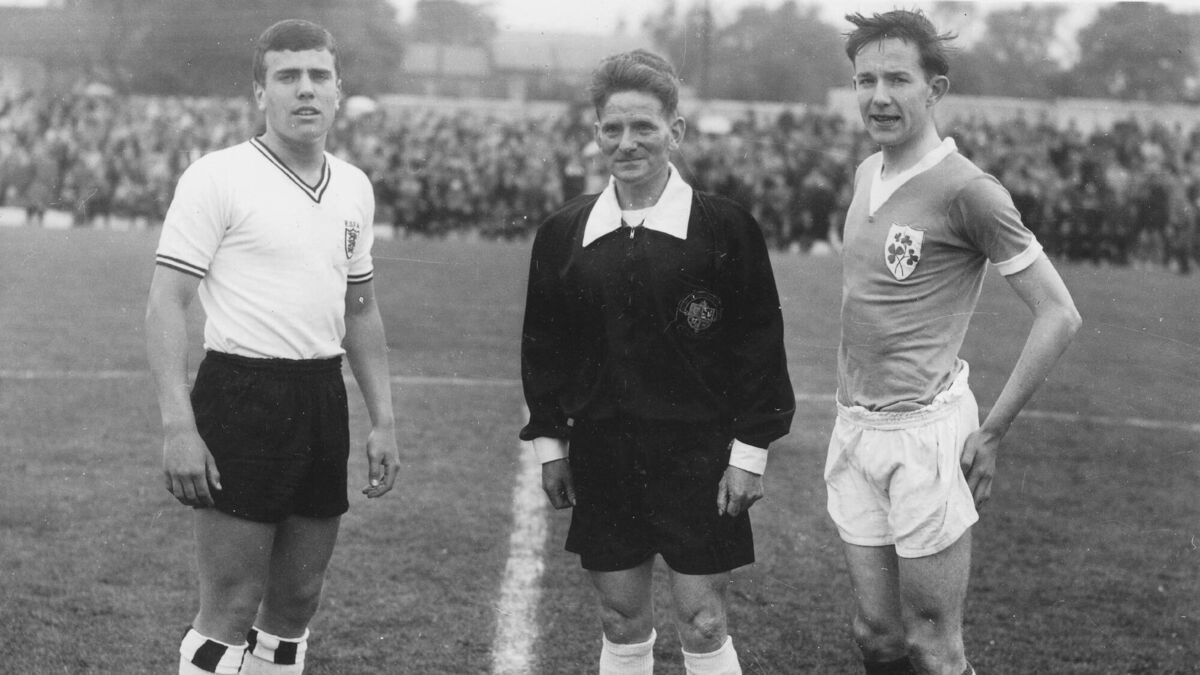Ireland v England at Flower Lodge in 1964. Centre: referee Sammy Spillane and on right Peter Cox.