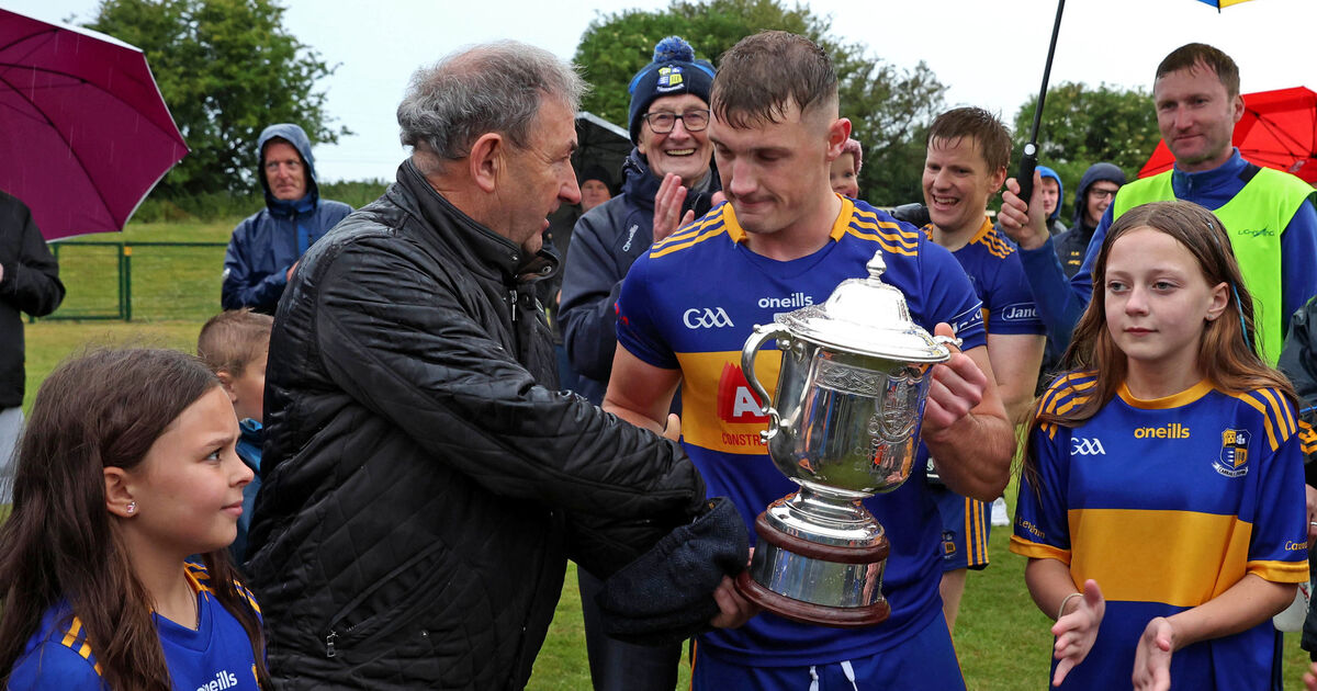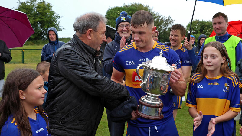 Denis Harrington, Cork County Board, presents the Bryan O'Loughlin Cup to Jack McCarthy, Carrigaline after winning Division 1. Picture: Jim Coughlan
