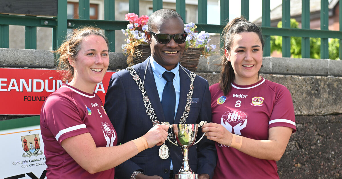 Cllr. Honore Kamegni who deputized for the Lord Mayor making the presentation Bishopstown joint captains Aimee Corcoran and Jennifer Ryle after their victory in the Seandún GAA and Cork City Council Muirgheal MacSwiney junior Camogie cup final at Ballinlough. Picture Dan Linehan