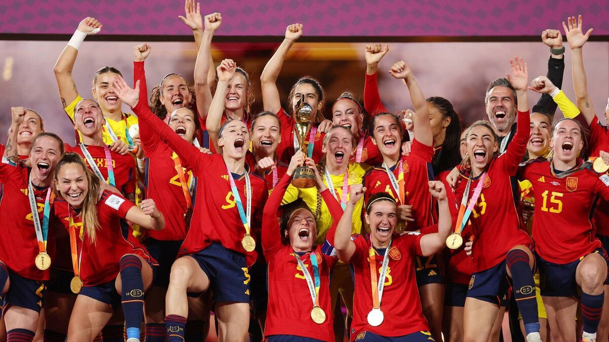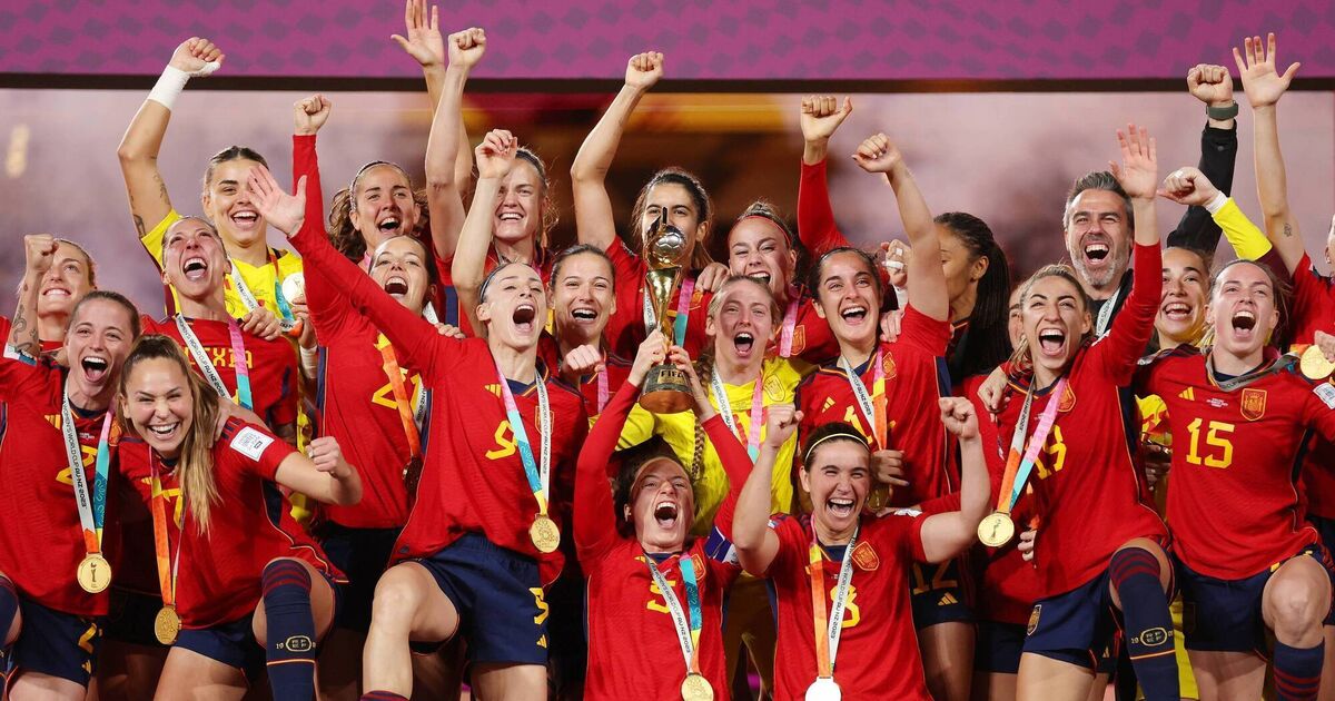 Ivana Andres of Spain and teammates celebrate with the FIFA Women's World Cup trophy at Stadium Australia on August 20, 2023 in Sydney / Gadigal, Australia. They are favourites to add the Olympic gold to the trophy. Picture Catherine Ivill/Getty Images