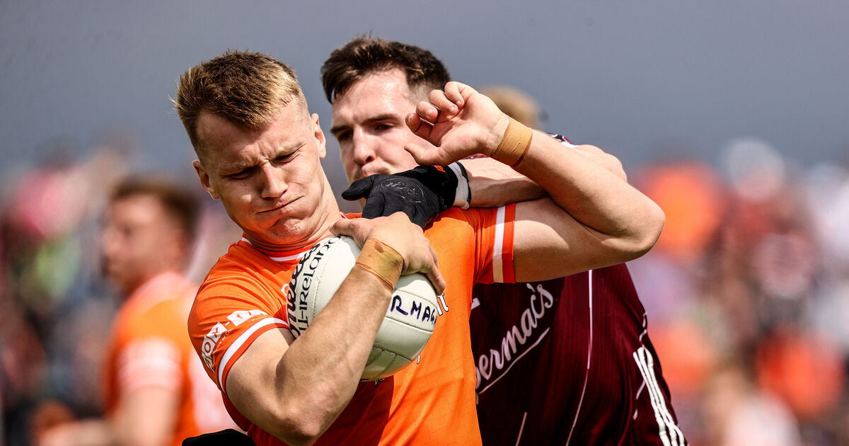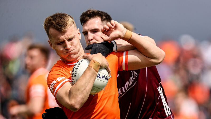 Armagh's Rian O'Neill is tackled by Cein Darcy of Galway earlier this summer. Picture: INPHO/Ben Brady