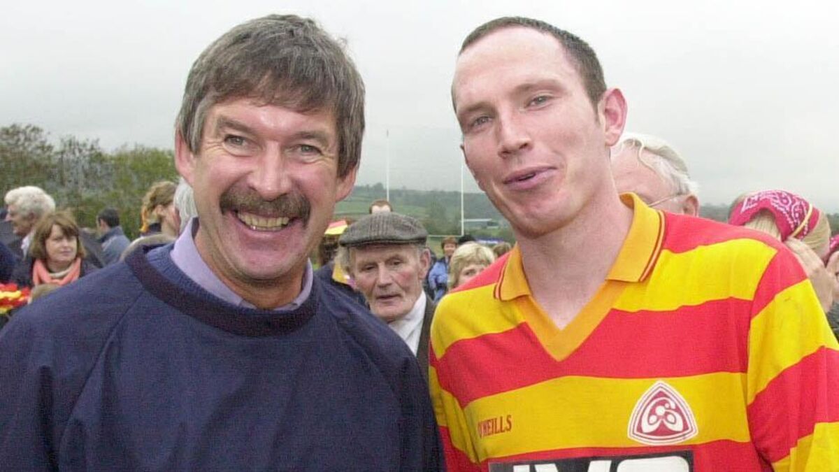 Newcestown captain Dan McCarthy after winning the IFC in 2001 with Kevin Kehily who captained the last Newcestown side to win the title in 1971. Picture: Denis Minihane