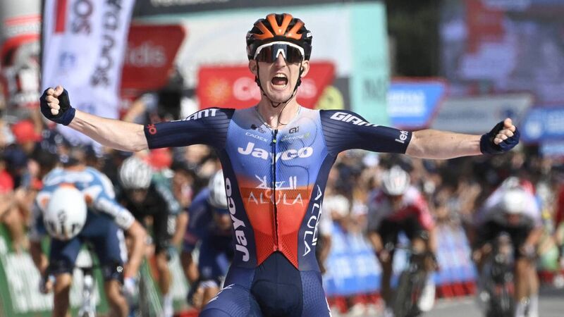 Cork's Eddie Dunbar, riding for Team Jayco-AlUla, celebrates winning stage 11 of the Vuelta a España on Wednesday. Picture: Miguel Riopa/AFP.