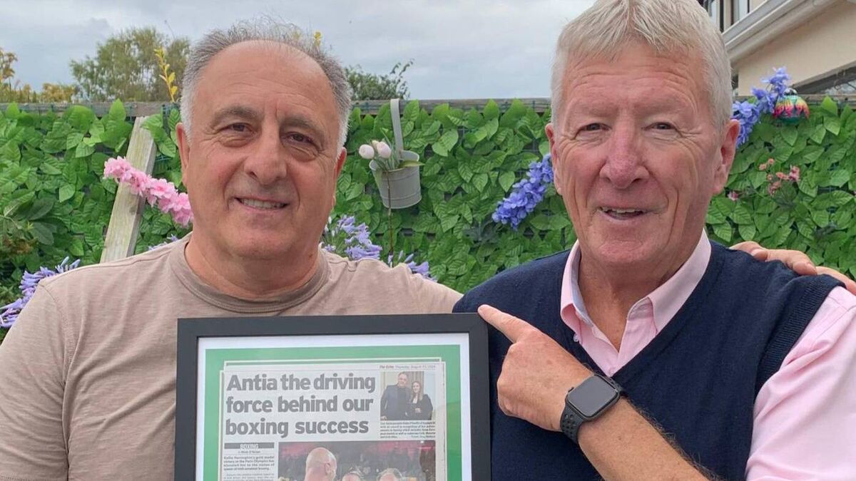 Cork Boxing: Dan O'Connell makes a framed presentation to Olympic coach Zaur Antia of the Echo report on the Olympic gold medal success of Kelly Harrington in Paris.
