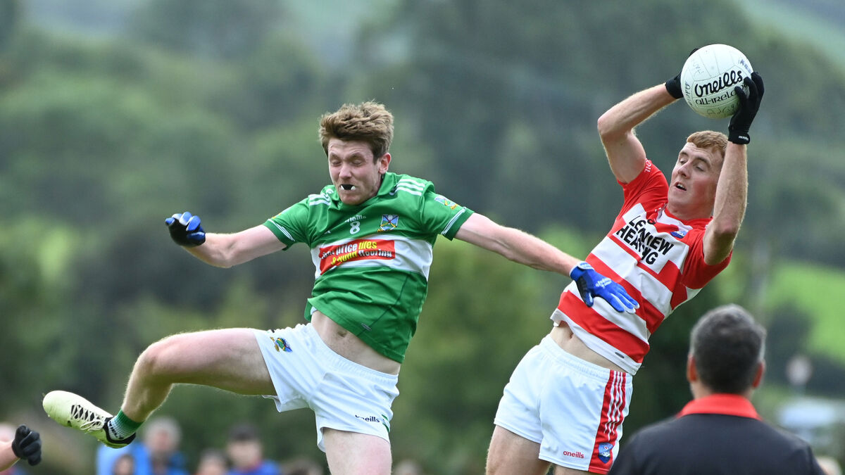 Adrigole's Neil O'Sullivan wins the ball in the air from Gabriel Rangers' Kieran Roycroft during the McCarthy Insurance IAFC at Kealkil. Picture: Eddie O'Hare