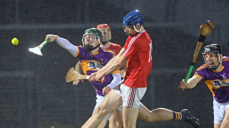 Ballygarvan's Niall Dowd shoots from St Catherine's Fionn O'Connell during the Co-Op Superstores Premier JHC semi-final on Friday night at rain-lashed Páirc Uí Rinn. Picture: Eddie O'Hare