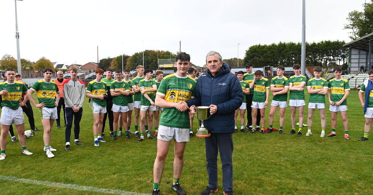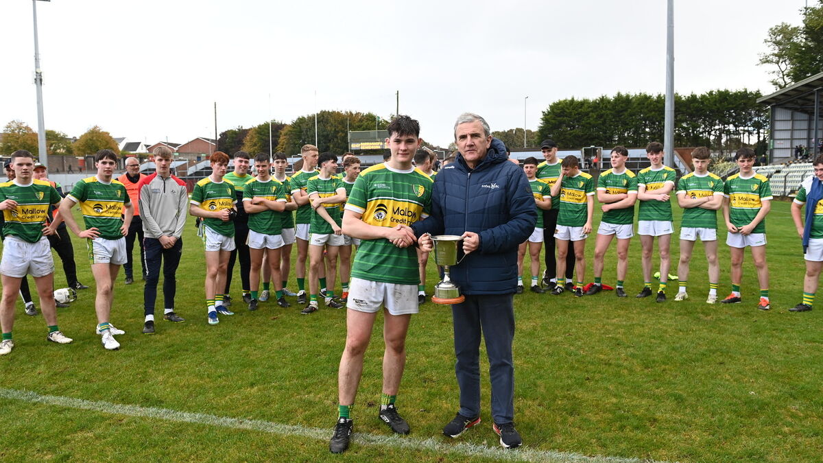 Jack Hogan, Shandrum, receives the cup from Michael O'Mahony, Rebel Óg, after beating St Finbarr's at Páirc Uí Rinn. Picture: Larry Cummins