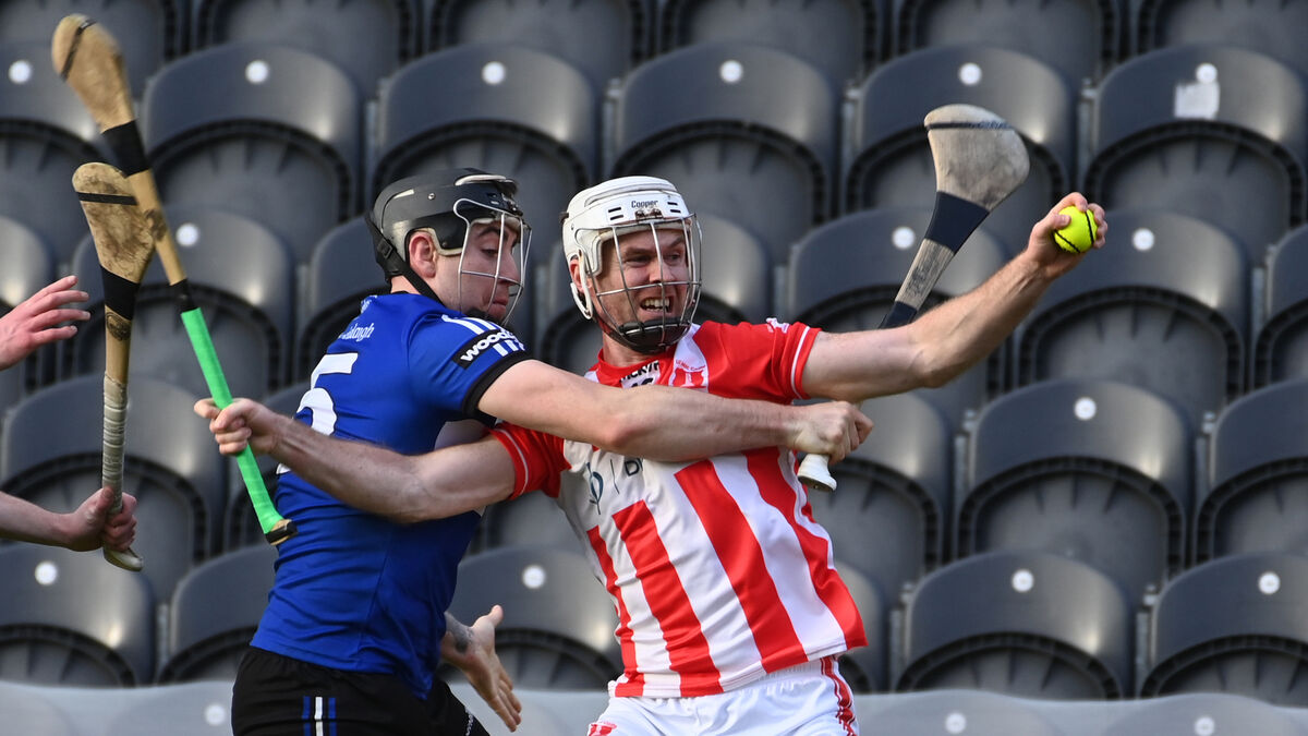 Imokilly's Brian Lawton is tackled by Sarsfields' Shane O'Regan during the Co-Op Superstores Premier SHC final at SuperValu Páirc Uí Chaoimh. Picture: Eddie O'Hare