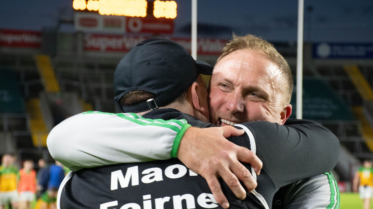 Glanmire manager Mark Hopkins hugs coach Wayne O'Donnell following the end of Saturday's McCarthy Insurance Group Cork IAFC final against Boherbue. Picture: Howard Crowdy