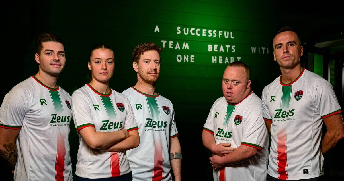 Wearing the new Cork City FC 2025 Home Jersey are Ruairí Keating, Men’s First Team; Niamh Cotter, Women's First Team; Ruairí Murphy, Amputee Team; Stuart McCarthy, Down Syndrome Futsal Team; Charlie Lyons, Men’s First Team. Pic Doug Minihane