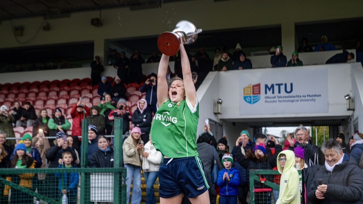 Aghada caption Róisín Phelan lifts the cup after winning the Ladies football A Final clash against Eire Og after a penalty shoot out in difficult conditions. Picture Chani Anderson