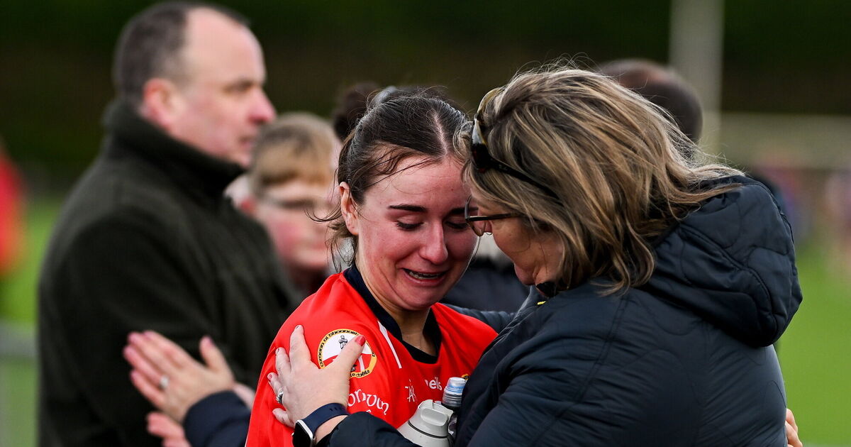 Emily Byrne of O'Donovan Rossa is consoled after defeat in the AIB All-Ireland Intermediate Club Championship semi-final match between Annaghdown of Galway and O'Donovan Rossa of Cork at St Brendan's Park in Claregalway, Galway. Photo by Brendan Moran/Sportsfile