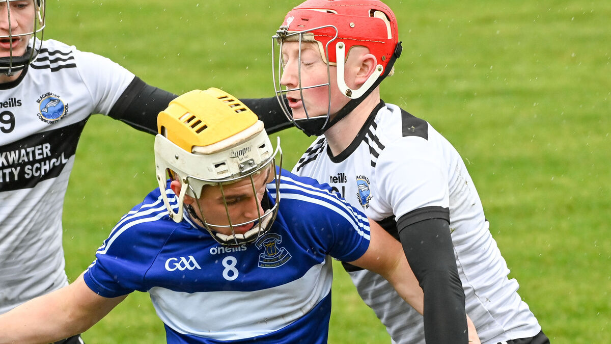 Gaelcholaiste Mhuire's Eoin Cronin is tackled by Harry O'Donovan of Blackwater Community School Lismore, during their Harty Cup clash at Castlelyons.