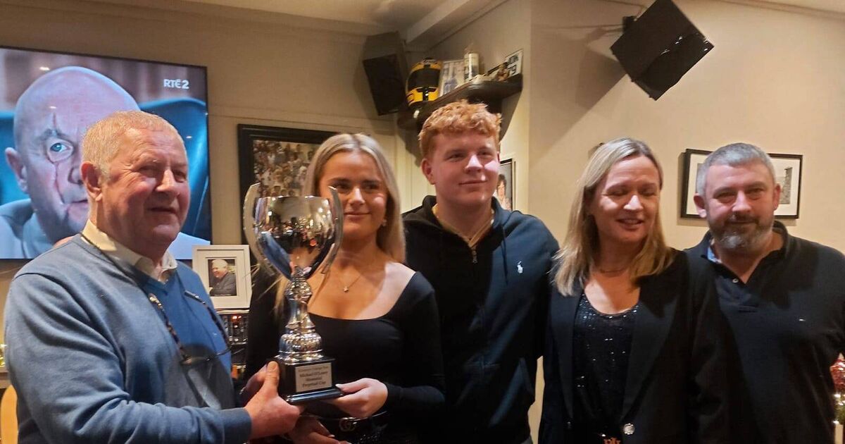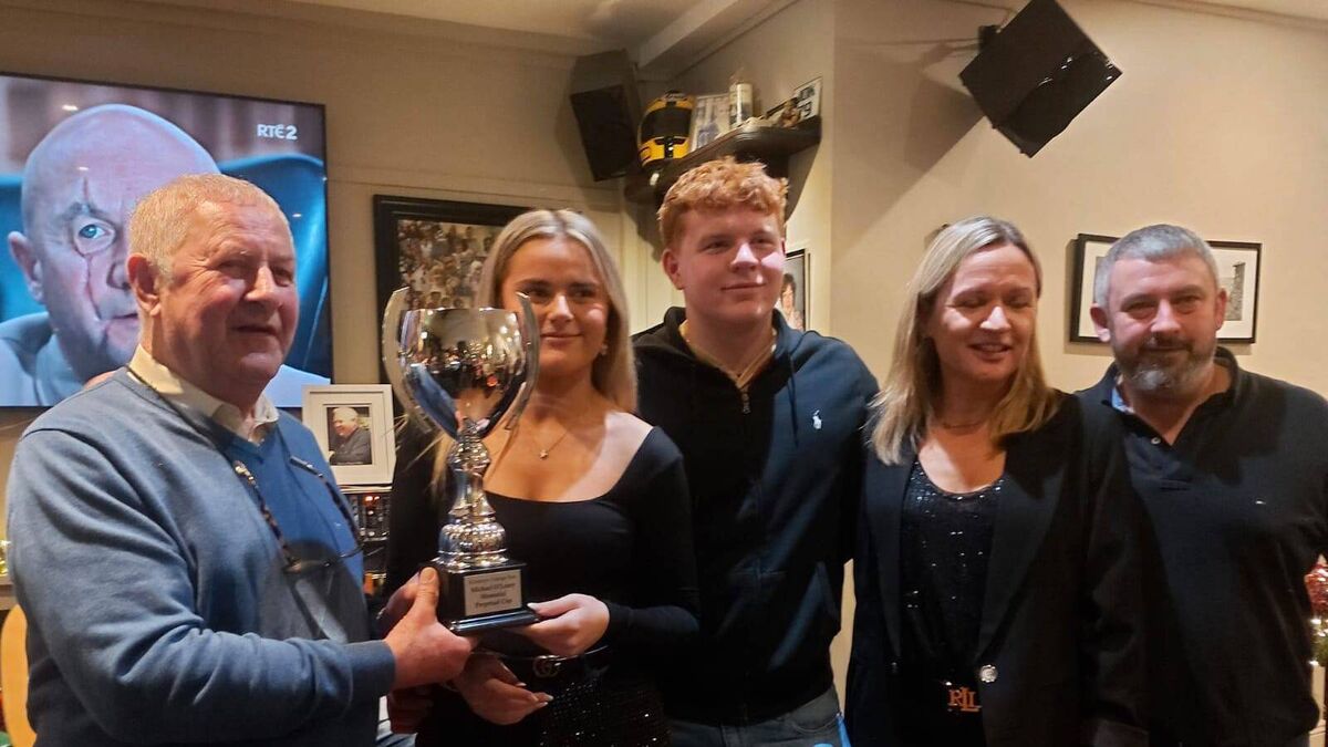 John O'Riordan presents the Mick O'Leary Cup to Ellen O'Leary.