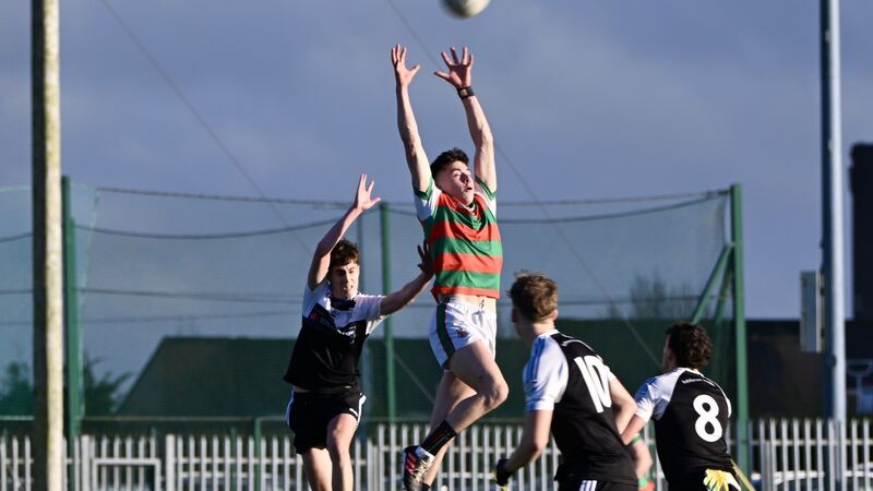 Kenmare’s Ben O’Callaghan and Mallow’s John Murphy in the air during the Corn Uí Mhuirí quarter final clash between Patrician Academy Mallow and Kenmare in Bishopstown on Wednesday. picture Chani Anderson