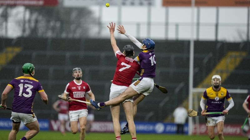 Cork's Robert Downey and Charlie McGuckin of Wexford battle for the ball last year. Picture: INPHO/James Lawlor
