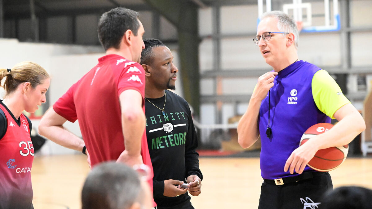 Referee Pelle Persson in discussion between Catalyst Fr Mathew's coach Keith Daly and Trinity Meteors coach Hillary Netts at the abandoned game on Saturday. Picture: Eddie O'Hare