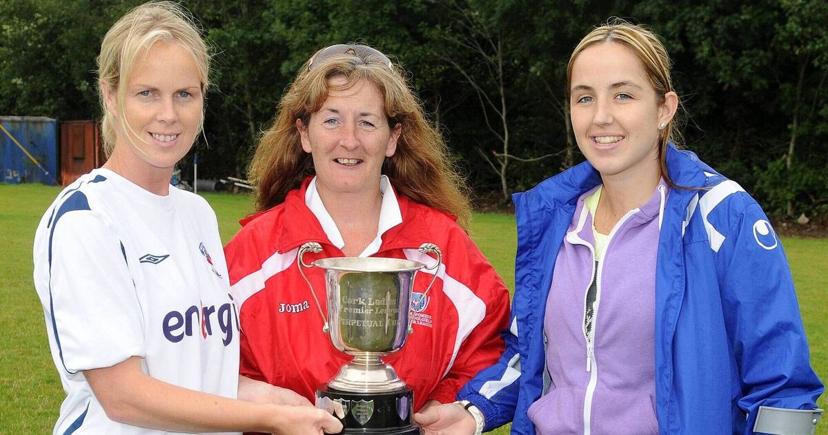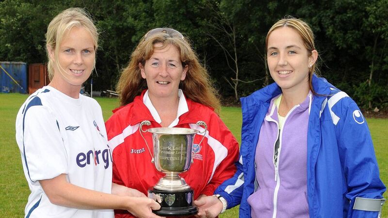Wilton United captain Barbara O'Connell receives the cup from Helen Noonan, secretary of CWSSL after retaining the Senior Premier League title at the Lee Road. Also included is Amanda Parkes of Wilton United. /Picture: David Keane.