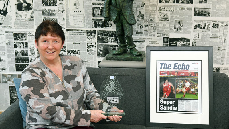 Sandie Fitzgibbon, The Echo Rebel Legends award winner, with the award and a framed front page of The Echo.