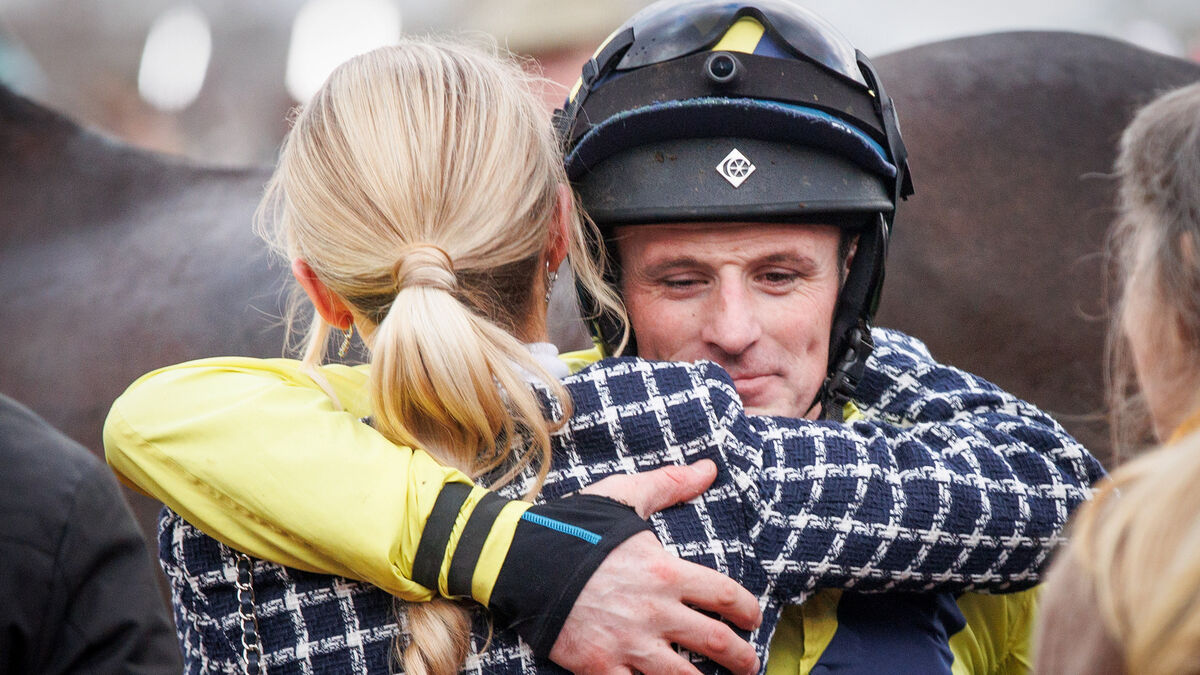 Sean Flanagan hugs the late Michael O’Sullivan’s girlfriend Charlotte Giles after winning on Marine Nationale. Picture: INPHO/Tom Maher