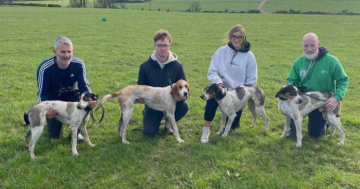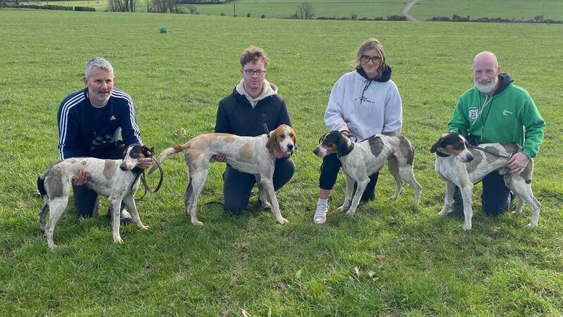 Cork Draghunting: The successful Northern Hunt kennel from left John O'Callaghan with Amazing (5th Senior Maiden); Brion O'Callaghan and Adonis (Senior Maiden winner), Ciara McSweeney and Authentic (Senior winner) and Dave McSweeney with Ashcroft (runner up in Senior) at the Clogheen Senior meeting at Glenville