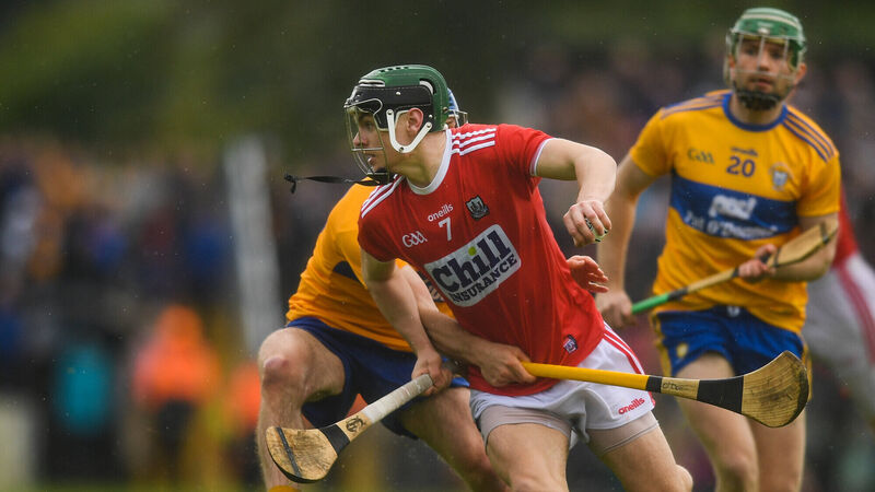 Mark Coleman of Cork holds possession despite the attentions of Clare's Shane O'Donnell in the 2019 Munster SHC game at Cusack Park in Ennis. Picture: Eóin Noonan/Sportsfile